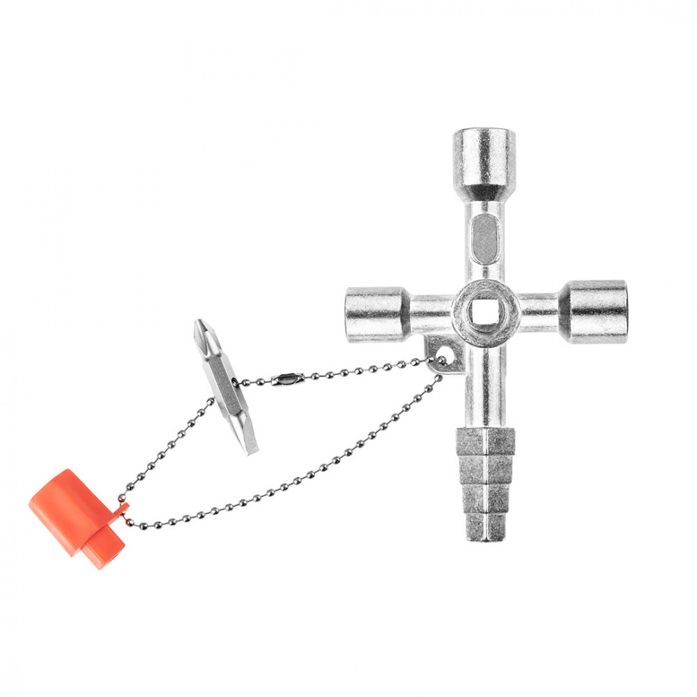 Univerzális épületgépészeti kulcs, lépcsős négyszög 6.2, 7.2, 8.2 mm, belső négyszög 7.2 mm és 8.2 mm, belső háromszög 10 mm, láncra fűzött dupla bitfej kereszthornyos PH2/lapos, 1/4 colos bitadapter, radiátorlégtelenítő kulcs